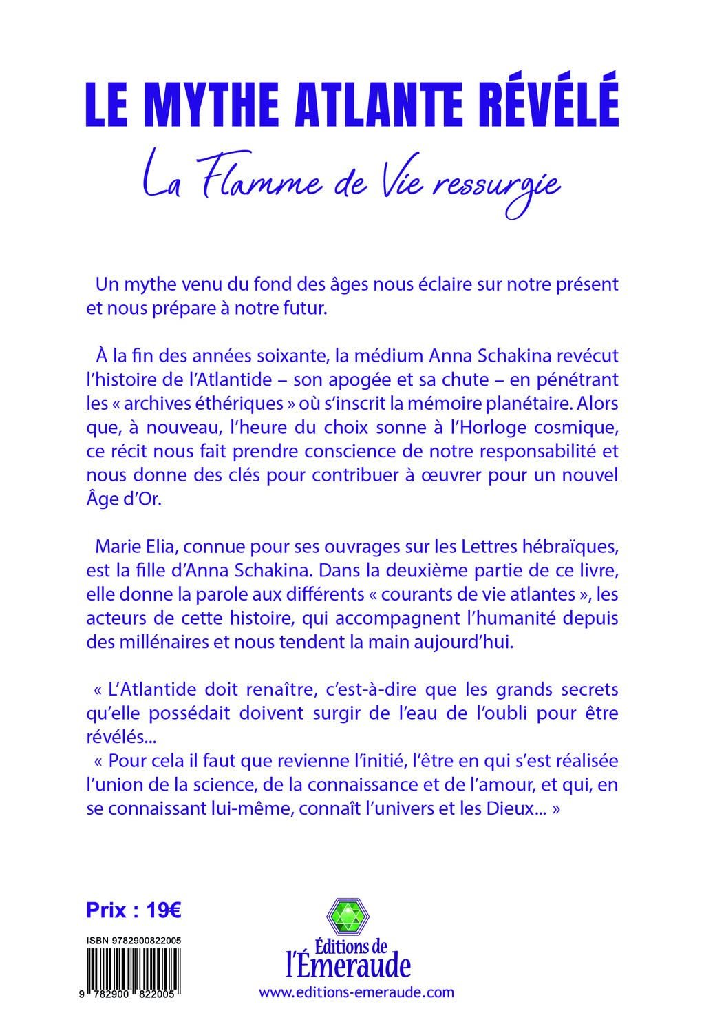 Un mythe venu du fond des âges nous éclaire sur notre présent et nous prépare à notre futur. À la fin des années soixante, la médium Anna Schakina revécut l’histoire de l’Atlantide – son apogée et sa chute – en pénétrant les « archives éthériques » où s’inscrit la mémoire planétaire. Alors que, à nouveau, l’heure du choix sonne à l’Horloge cosmique, ce récit nous fait prendre conscience de notre responsabilité et nous donne des clés pour contribuer à œuvrer pour un nouvel Age d’Or. Marie Elia, connue pour ses ouvrages sur les Lettres hébraïques, est la fille d’Anna Schakina. Dans la deuxième partie de ce livre, elle donne la parole aux différents « courants de vie atlantes », les acteurs de cette histoire, qui accompagnent l’humanité depuis des millénaires et nous tendent la main aujourd’hui. « L’Atlantide doit renaître, c’est-à-dire que les grands secrets qu’elle possédait doivent surgir de l’eau de l’oubli pour être révélés… Pour cela il faut que revienne l’initié, l’être en qui s’est réalisée l’union de la science, de la connaissance et de l’amour, et qui, en se connaissant lui-même, connaît l’univers et les Dieux… ».