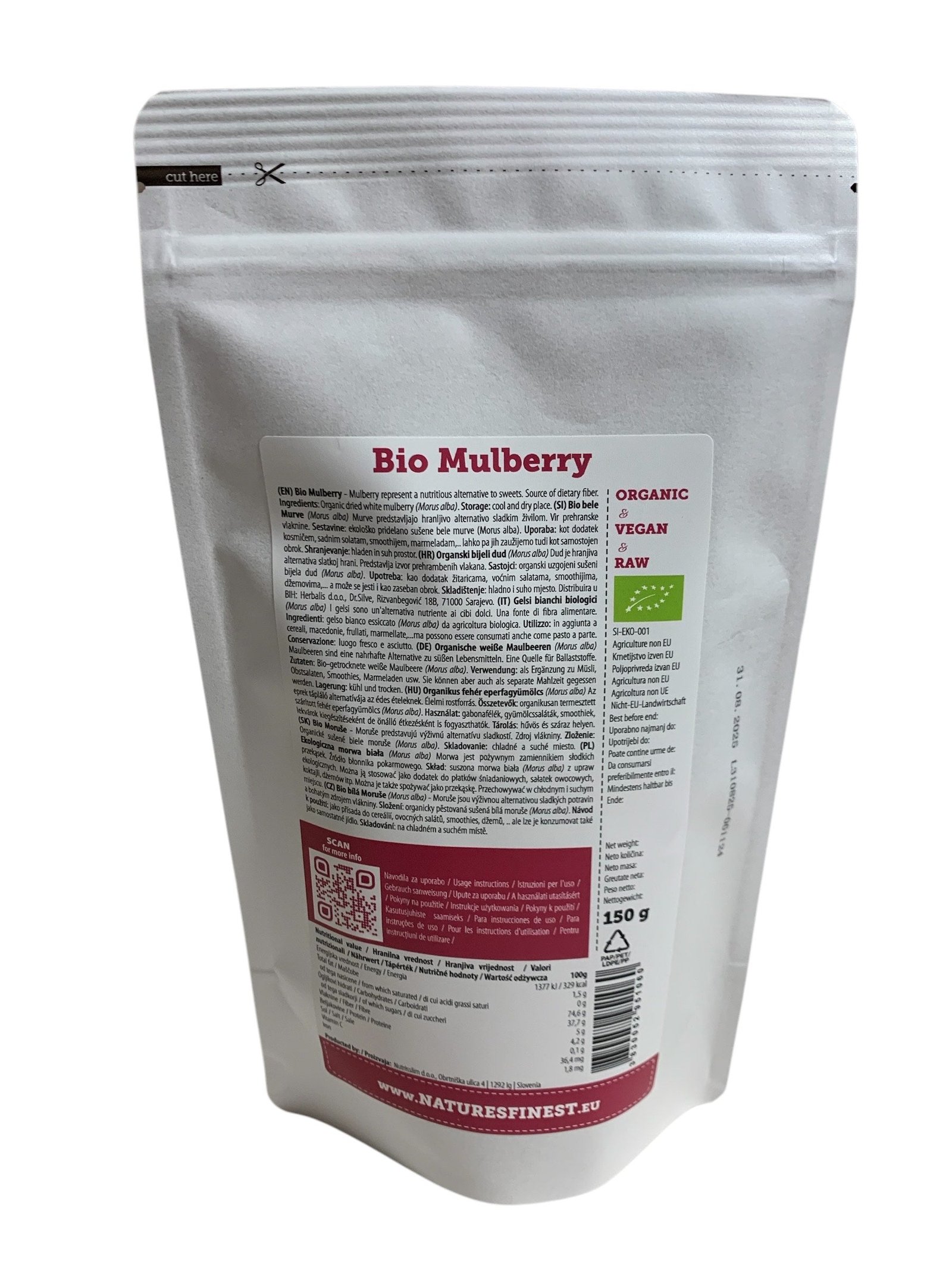 Les mûres blanches séchées (Morus alba), aussi appelées Mulberries, sont un superaliment prisé pour leur douceur naturelle et leur richesse en vitamines, fibres et minéraux. Leur goût délicatement sucré rappelle le miel et le caramel, ce qui en fait une alternative saine aux snacks industriels.